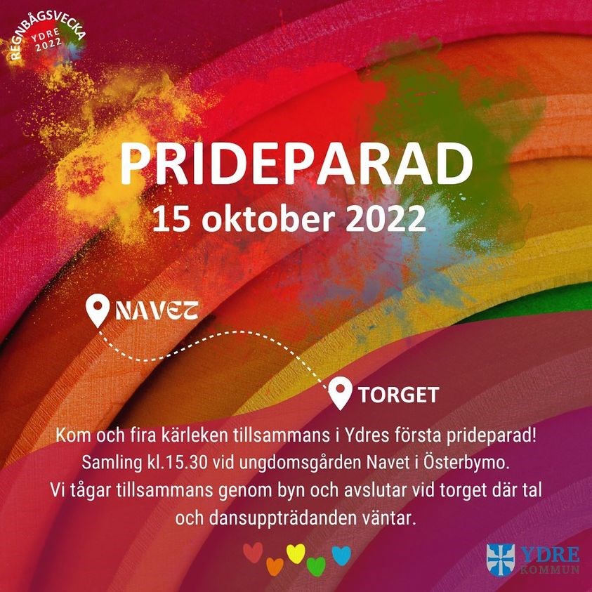 Imorgon lördag 15/10 är det prideparad samling 15.30 vid ungdomsgården Navet. Paraden avslutas vid torget där tal och framträdanden kommer ske. Delta för alls rätt att få vara den man vill vara och älska den man vill älska! Källa: Ydre Kommun. (2022-10-14). Imorgon är det dags! Kom på förfesten redan idag, läs mer i händelser!. Fackebook. https://www.facebook.com/photo?fbid=488438103322925&set=a.215866610580077
