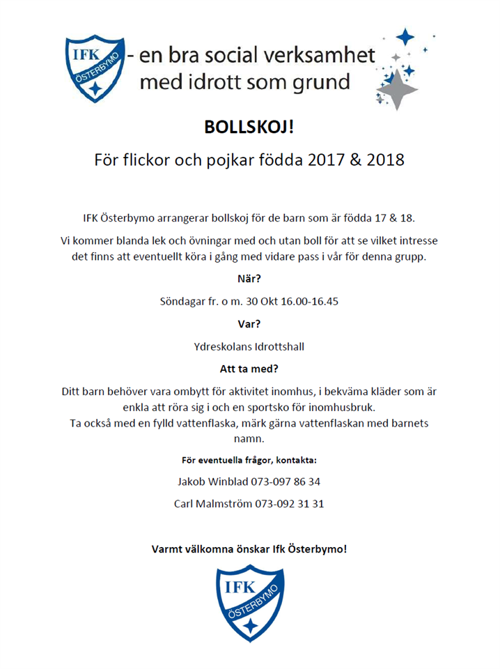 Nu drar IFK Österbymo igång bollskoj för flickor och pojkar födda 2017 och 2018. Det kommer bli lek och övningar med och utan boll, finns intresse kommer vi eventuellt att fortsätta mer fler pass för barnen i dessa årskullar. När? Söndagar fr. o m. 30 Okt 16.00-16.45 Var? Ydreskolans Idrottshall Att ta med? Ditt barn behöver vara ombytt för aktivitet inomhus, i bekväma kläder som är enkla att röra sig i och en sportsko för inomhusbruk. Ta också med en fylld vattenflaska, märk gärna vattenflaskan med barnets namn. Vid eventuella frågor, kontakta: Jakob Winblad 073-097 86 34 Carl Malmström 073-092 31 31 Varmt välkommna önskar IFK!