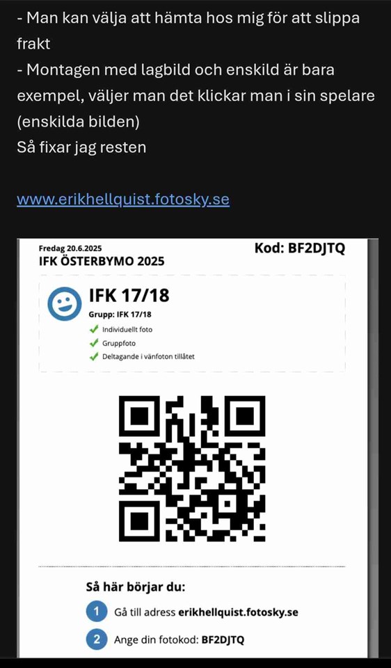 Hej! Nu har vi fått koden som behövs för att logga in och beställa de foton som togs tidigare i juni på våra spelare! Se biforgas bild för länk samt kod! Hoppas alla får en fin midsommar och ledighet så ses vi söndagen 3 augusti för träning igen! Mvh Sanna U-17/18/19 19 jun 2025 0kommentarer
