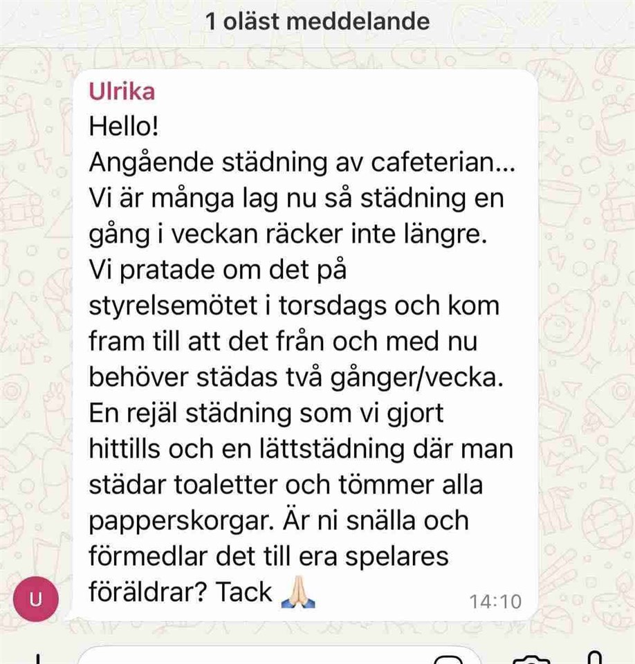 Hej! Vecka 26 (23-27/6) är det vår tur att ansvara för städ på bulevallen! Här kommer en påminnelse till vårdnadshavare för: Arvid, Lorenzo, Maja och Tyra Ni ansvarar för att det blir städat 2 gånger den veckan. Kan ni inte själva får ni ordna med ersättare! Kom tillsammans överens om vilka dagar ni ska städa! Om ni behöver låna nyckel från någon av oss ledare så hör ni bara av er! 😀 Lista på vad som ska göras sitter i städskrubben (mellan kiosken och a-lagets omklädningsrum). Hör av er om ni har frågor!